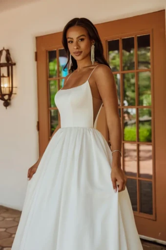 Sleek and sophisticated, this modern ballgown wedding dress redefines bridal elegance with its luxe satin construction. Style 8024’s simplicity is its strength, featuring a fitted lined bodice with delicate spaghetti straps that flow into a graceful scooped neckline. Sexy side cutouts daringly dip to the waistline, adding a contemporary edge to a classic ballgown silhouette. The open back showcases a striking V-shaped detail, adorned with fabric-covered buttons that cascade down the entire length of the gown. A gathered, ruched waistline blooms into a full satin ballgown skirt with discreet pockets for the modern bride who appreciates both style and functionality. For a dramatic and effortlessly chic gown, this simple ballgown wedding dress was made for the modern bride. This wedding gown is also available in plus sizes.