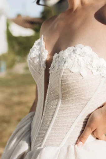 For that true princess moment, Style 8048 delivers a breathtaking strapless tulle ballgown that combines classic elegance with modern sophistication. The sheer strapless bodice features a timeless sweetheart neckline with a daring deep plunge, beautifully framed by optional pearl-embellished floral lace to trim the top edge. With its sheer ruched construction, exposed corset boning adds a subtle sexy elegance to this magical wedding gown. From the bodice to the skirt, glittering sparkle tulle catches and reflects the light with every movement. A classic basque waistline marks the transition to the skirt, where gathered tulle unfolds into a voluminous, princess ballgown silhouette for an enchanting wedding day look.